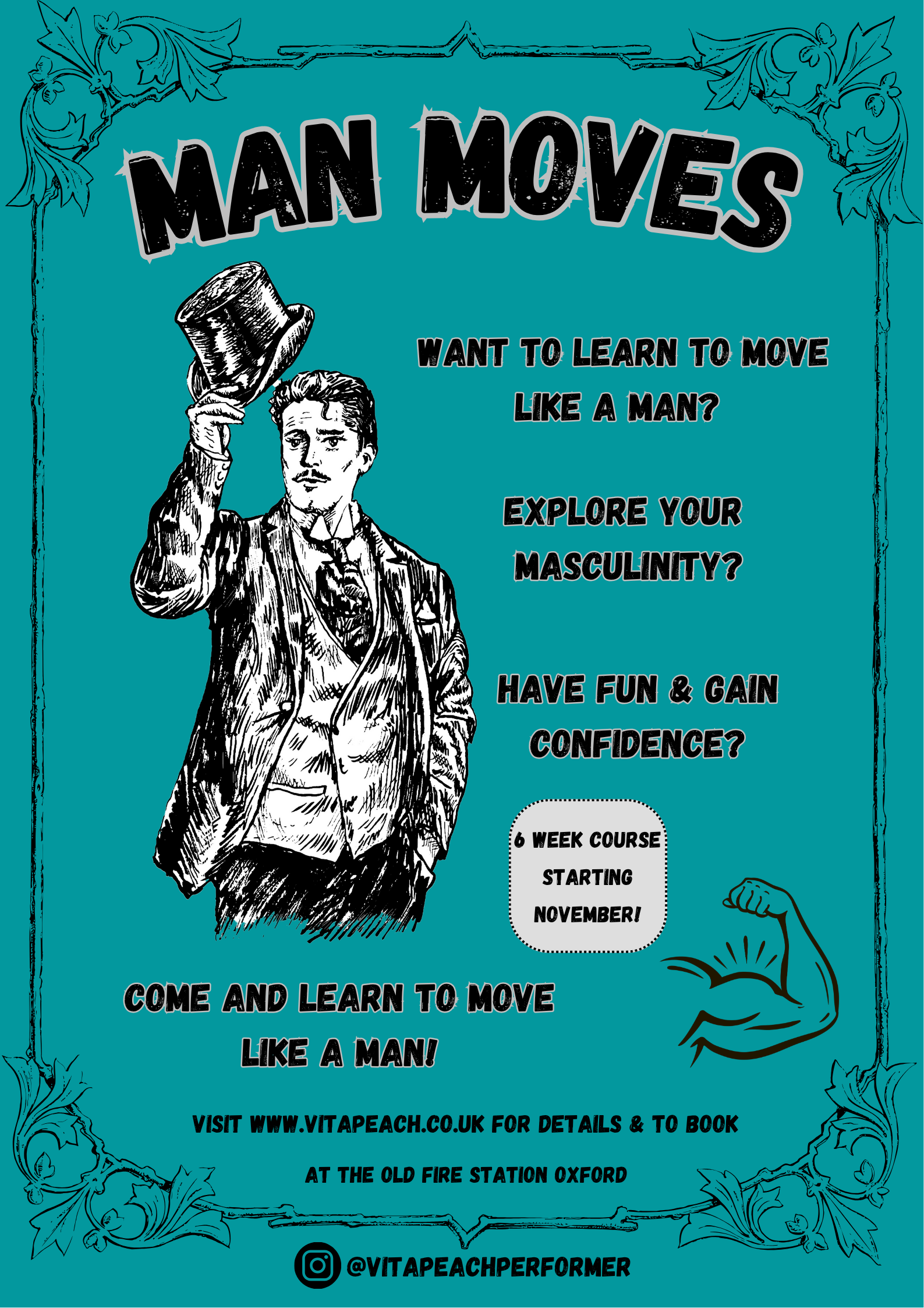 In this six week course we will look at how stereotypically masculine men move, and explore the main differences between how men and women move. Each week, we will learn basics like how to walk, stand, pose and gesture like a man. We will try using elements of costume and props to inspire movement and male characters. You will learn manly dance routines and work on developing your own male persona(s).